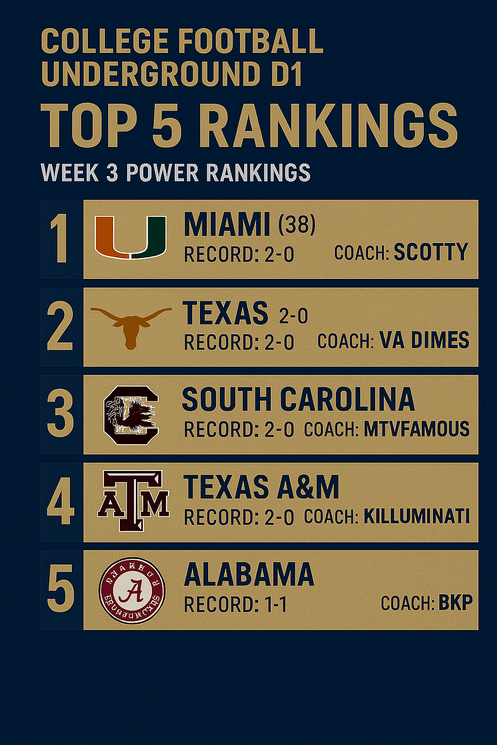 As the dust settles on another wild weekend of action in the College Football Underground D1 League, the elite are starting to rise and separate from the rest. Week 3’s power rankings are officially locked in, and it’s clear: the top contenders are here to dominate.